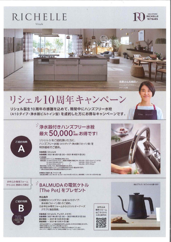 リシェルSIをご成約いただいた方に、ハンズフリー水栓(A10タイプ・浄水器ビルトイン型)を特別価格でご提供。