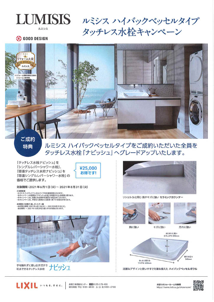 ルミシス/ハイバックベッセルタイプをご成約いただいた全員をタッチレス水栓「ナビッシュ」へグレードアップいたします!!