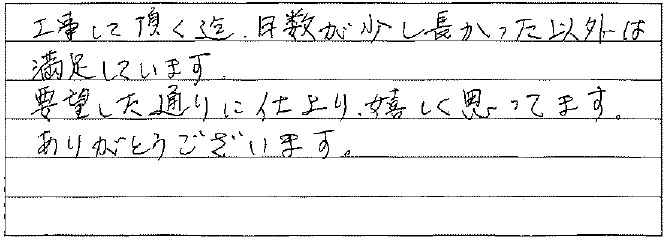 担当者さん、工事の職人さん達、スタッフの皆さんの対応の良さ。私達の声にちゃんと耳をかたむけていただき安心して工事を任せることが出来ました。ありがとうございました。又、よろしくお願いします。