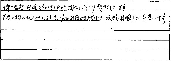 こちらの希望に合わせて工事の都合を融通きかせてくださったこともあり感謝しても感謝しきれないくらいです。