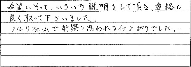 お話がしやすく、要望を正しく理解していただけるため、行き違いなども起きませんでした。またリフォームをするときは必ずこちらでお願いします。
