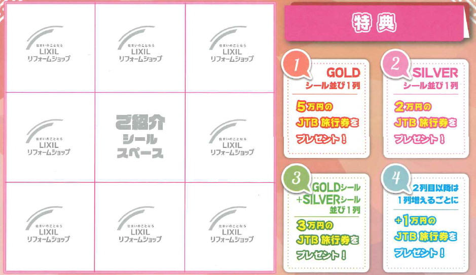 リクシルのショールームで御見積、対象商品のご契約で1商品につき1枚のBINGOシールを