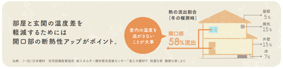 上の図を見ると、特に窓や玄関から熱が流出していることが分かります。