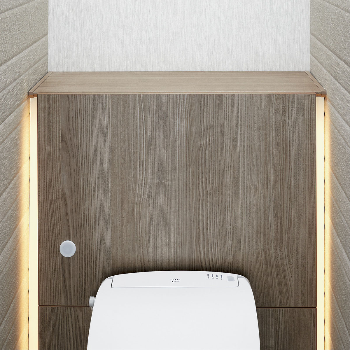 給水管やタンクなどをまとめてバックパネルに隠し、空間全体をすっきりした印象に。