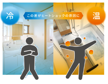 ヒートショックとは「暖かい部屋から寒い部屋への移動など、温度の急な変化が身体に与えるショック」のことをいいます。寒い日の入浴は脱衣所を暖め温度差を少なくすることでヒートショック対策につながります。