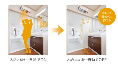 人感センサーをONにしておけば、人の往来を検知して自動で運転を開始します。また、不在を検知した時には約1分後に待機状態に切り替わる優れもの!都度の運転操作や消し忘れの心配もいらず、電気代を抑えたかしこい運転が可能です。