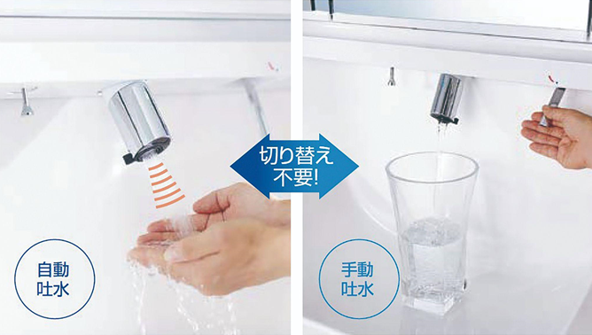 自動吐水では"手をふれずに差し出すだけのワンアクション"で水が出てくるので、ハンドルを汚さずに手を洗うことでできます。