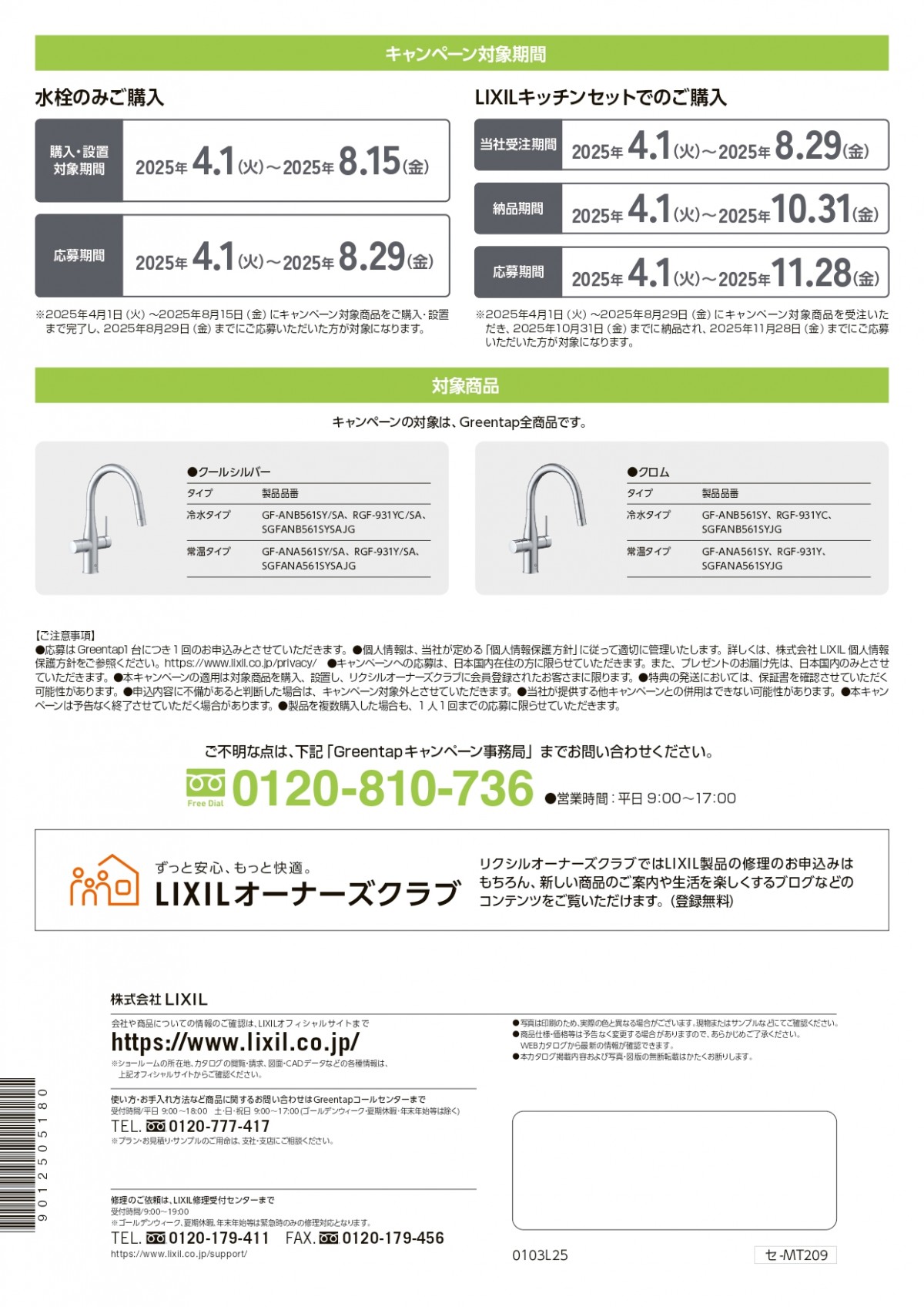 キャンペーンの適用は、対象商品を購入・設置し、「LIXILオーナーズクラブ」に会員登録されたお客様に限ります。LIXILオーナーズクラブへの会員登録は無料です。